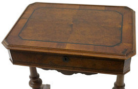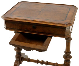 Tavolino da lavoro impiallacciato in radica di noce con profili ebanizzati, fine XIX-inizi XX secolo, fronte a due cassetti, gambe tornite riunite da traversa, piedi sagomati, cm 71x57,5x41, (difetti).
