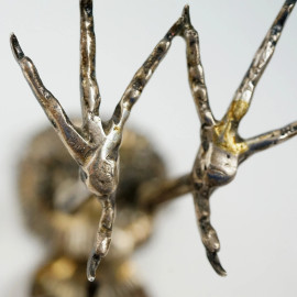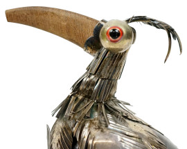 Tucano, scultura in argento 925, con corpo ovoidale in occhio di tigre, becco in legno ed occhi in vetro, cm h 16,5 , XX secolo, (difetti).