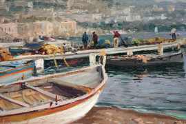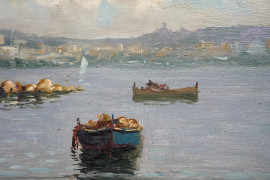 Veduta costiera con pescatori, olio su tavoletta, XX secolo, ingombro totale con cornice cm 27x57.