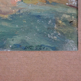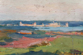 Veduta costiera, olio su cartone, cm 16,5x41, firmato, entro cornice.