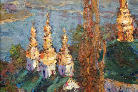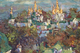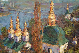 Veduta di Kiev, olio su tela applicata su masonite, cm 23x50, XX secolo, entro cornice.
