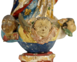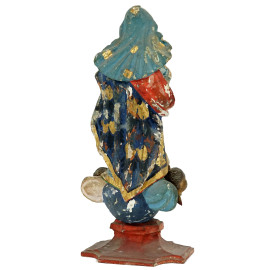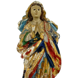 Vergine Immacolata, scultura in legno intagliato, dorato e dipinto in policromia, cm h 28,5, Brasile, XVIII- XIX secolo, (difetti).