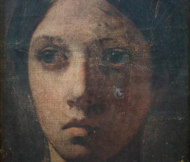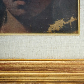Volto di donna, olio su tela applcata su cartone, cm 25,5,x19, fine XIX secolo, entro cornice, (cadute di colore).