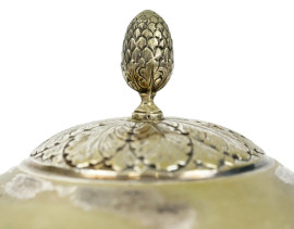 Zuccheriera in argento, XX secolo, corpo baccellato con manici a volute vegetali, coperchio con presa a forma di pigna, base circolare con profilo a palmette, cm h 18, peso gr. 450, (difetti)