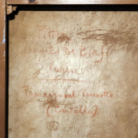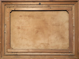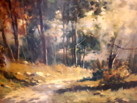 Angelo De Biasi (XIX-XX sec.), Paesaggio boschivo con sentiero, grande dipinto ad olio su tela, cm 80x120, firmato, entro importante cornice coeva.