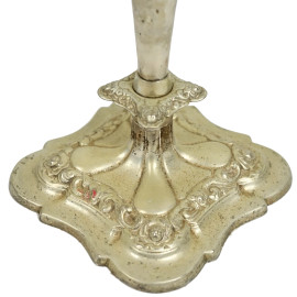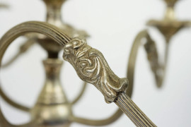 Candelabro a cinque fiamme in metallo argentato, Jordan Sheffield Collection, seconda metà XX secolo, con bracci sinuosi e fusto liscio poggiante su base quadrangolare, cm 41x43., (segni del tempo).