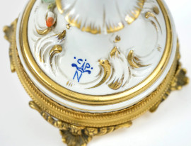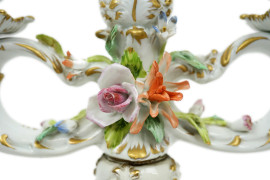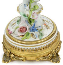 Candeliere a tre luci in porcellana policroma con decori di fiorellini e lumeggiature dorate, base in metallo dorato, cm h 29,5x20, marcato, XX secolo.