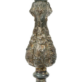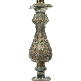 Candeliere in Sheffield a cinque fiamme, XX secolo, quattro bracci sinuosi, cm h 46.