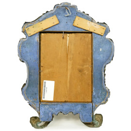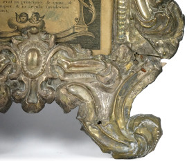 Cartagloria di linea sagomata rivestita in lamina, interamente sbalzata a volute e controvolute, piedini a ricciolo, supporto ligneo, XIX secolo, cm 38x29, (difetti).