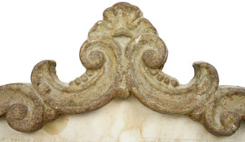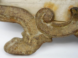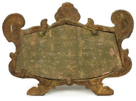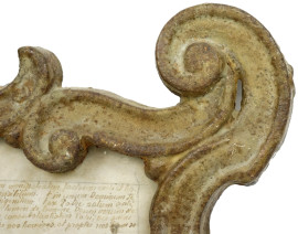 Cartagloria di linea sagomata, XIX secolo, recante preghiera manoscritta su cartiglio interno, piedini a ricciolo, ingombro cm 22x30, (difetti).