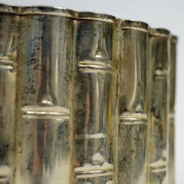 Centrotavola in metallo argentato, con decoro sbalzato a canne di bamboo, cm h 11,5x19, XX secolo.