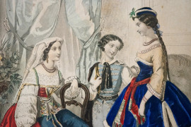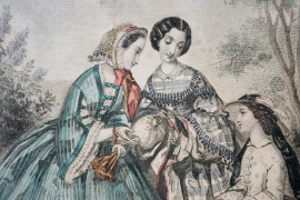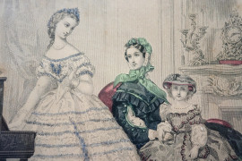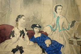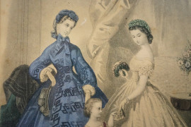 Cinque stampe raffiguranti fanciulle in abiti alle moda, stampe acquarellate, misure max cm 24x15,5 circa, XIX secolo, alcune tratte da Le Mode Illustrée, entro cornici, (macchie).