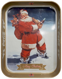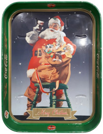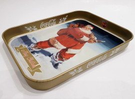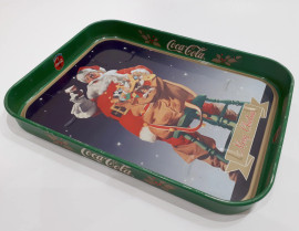 Coca Cola, coppia di rari vassoi vintage in latta prodotti in serie limitata per le festività natalizie, ciascuno cm 28x21