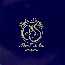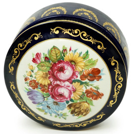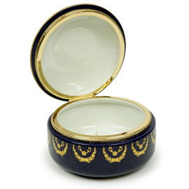 Cofanetto in porcellana blu cobalto e oro con decori policromi dipinti a mano raffiguranti bouquet di fiori, CEAS Style Sévres, XX secolo, cm 7,5x14.