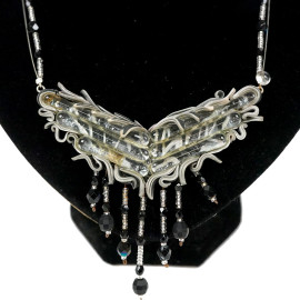 Collana con pendente in paste vitree nere e argentate, perline sfaccettate nere cangianti, chiusura in argento, lunghezza cm 47, (difetti).