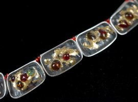 Collana girocollo semirigida in vetro trasparente e arancio con inclusioni dorate, montatura in argento