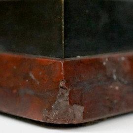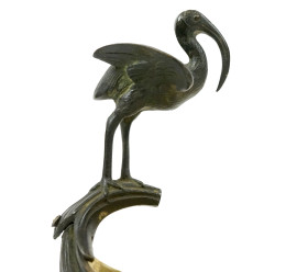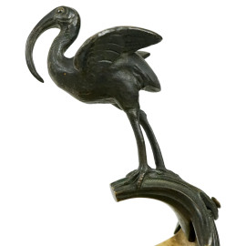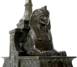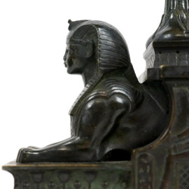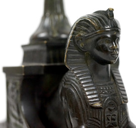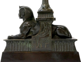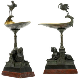 Coppia di alzatine a navicella Retour D’Egypte, XIX secolo, in bronzo brunito e dorato, vaschette con prese a foggia di pellicani, fusto sorretto da coppia di sfingi poggianti su basi in marmo rosso, cm h 35x16x9,5, (difetti).