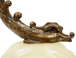 Coppia di candelieri in pietra dura con bobeches a foggia di tulipani, fusti in metallo argentato raffiguranti animali marini, cm h 19,5, XX secolo, (difetti e restauri).