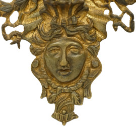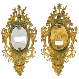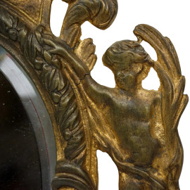 Coppia di piccole specchiere ovali in bronzo dorato, XX secolo, cornice lavorata a foggia di quattro putti reggi palme e finale a testa di gorgone, cm 36x18