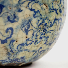Coppia di sfere in ceramica a smalto bianco e blu craquelé, alt. cm 20 circa, XX secolo, (difetti di cottura).