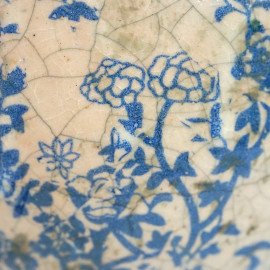 Coppia di sfere in terracotta smaltata con decori floreali blu su fondo rosa a craquelé, cm h 20 circa, (difetti di cottura).