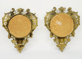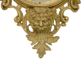Coppia di specchiere ad assetto tondo, XX secolo, cornice in bronzo decorata a volute foglie e mascheroni, cm 34,5x27.