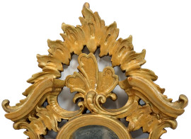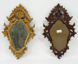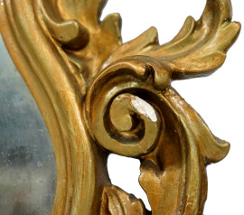Coppia di specchiere stile barocco in legno dorato, cornice decorata a volute a foglie d'acanto e volute, cm 68x41,5, XX secolo.