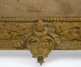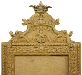 Cornice in bronzo, XX secolo, cimasa con decoro di corona, particolari di festoni laterali e piedini a foggia di animali marini, ingombro tot cm 42x27, (lievi difetti).