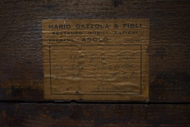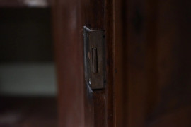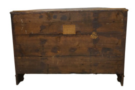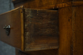 Credenza scantonata in noce, XVIII secolo, intarsio geometrico nella fascia sottopiano, fronte a tre cassetti e quattro sportelli pannellati, cm h 101x147x49, (difetti, elementi sostituiti)