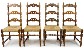 Due poltrone e quattro sedie con struttura in noce, prima metà XX secolo, cartelle intagliate a giorno, sedute in paglia, gambe tornite riunite da traversa, cm h 100, (difetti).