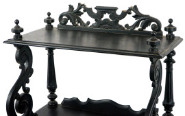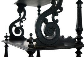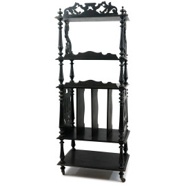 Etagère in legno ebanizzato, XIX secolo, a cinque ripiani e scomparti per riviste, montanti a ricciolo e torniti, poggiante su rotelle, cm 137x55x35, (difetti).