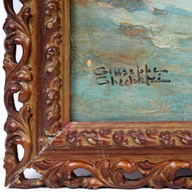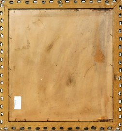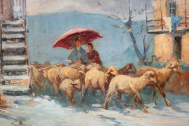 Figure con gregge, olio su tela riportata su cartone, cm 49x45, firmato, entro cornice.
