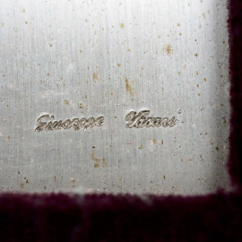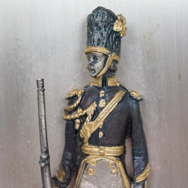 Giuseppe Vasari (1934-2005),Soldato con fucile, scultura in metallo argentato e dorato, entro cornice, misure ingombro cm 23x17, (lievi difetti)