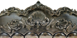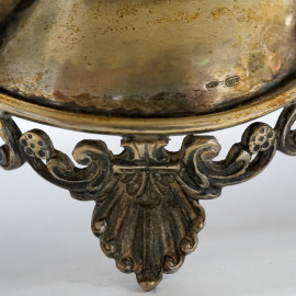 Grande centrotavola di linea ovale in argento 800, Firenze, seconda metà XX secolo, doppia presa laterale, corpo baccellato e decori incisi, cm 18,5x45,5x25,5, peso gr.1845