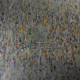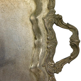 Grande vassoio di linea sagomata in Sheffield, XX secolo, manici a volute fogliate e motivi di gusto rocailles, quattro piedini traforati, cm 72,5x45,5.