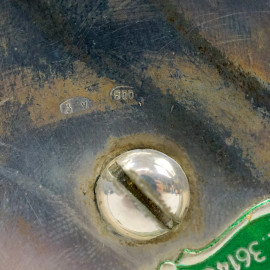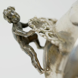 Lampada in argento 800, doppia presa a foggia di puttini, cm h 27x14, seconda metà XX secolo, peso lordo gr.594, (difetti, appesantita).