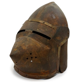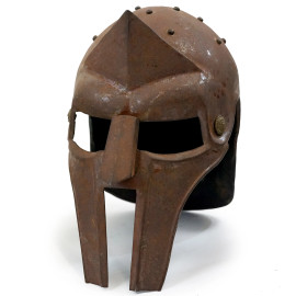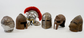 Lotto composto da sei elmi in ferro battuto e metallo argentato, riproduzioni del XX secolo, altezza max cm 33
