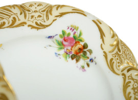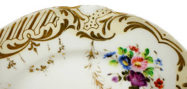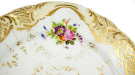 Lotto composto da sei piatti in porcellana bianca a decoro floreale con particolari dorati, Francia, fine XIX secolo, diam. cm 22, (difetti).