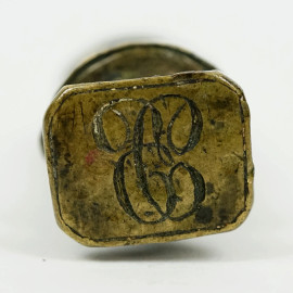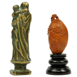 Lotto composto da un piccolo sigillo in bronzo raffigurante Madonna con Bambino ed una piccola scultura di Saggio in lettura entro mandorla in lacca, cm h 6,7, XX secolo.
