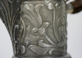 Lotto composto da un vassoio in vetro e Sheffield ed una caffettiera in peltro, alt. max cm 29,5, XX secolo, (segni del tempo).