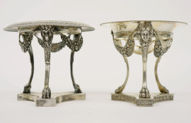 Lotto di basette a tripode in argento con piedi caprini e leonini, cm h 9, XX secolo, peso gr.245, (segni del tempo, un cucchiaino non pertinente).