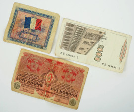 Lotto di tre banconote con valute diverse, misure max cm 11x7, (difetti)