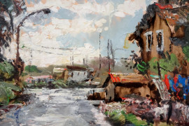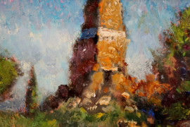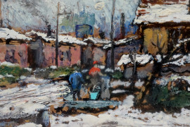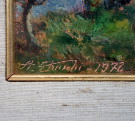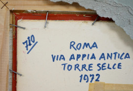 Lotto di tre dipinti ad olio su tavoletta raffiguranti la Torre Selce sull'Appia antica e paesaggi innevati, misure max cm 13x17, firmati, entro cornici.