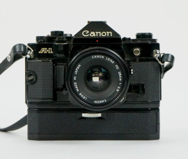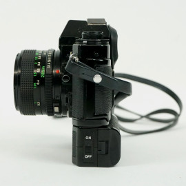 Macchina fotografica Canon A-1, completa di due obiettivi ed accessori, ingombro cm 13x14, entro borsa a tracolla, (segni del tempo).