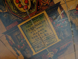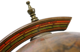 Mappamondo da tavolo in legno e carta applicata, poggiante su base circolare, XX secolo, cm h 56, (difetti)