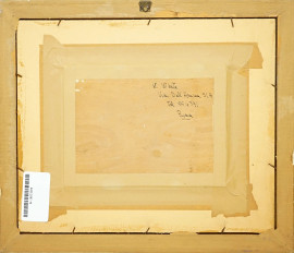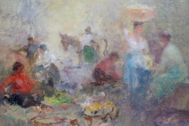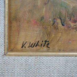 Mercato, olio su tavoletta, cm 14x18,5, firmato V.White, entro cornice.