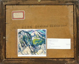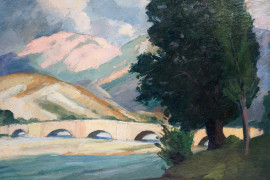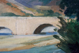 Paesaggio con ponte, olio su carta applicata su cartone, cm 33x41,5, firmato a tergo, entro cornice.