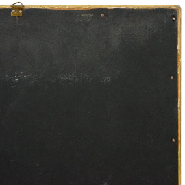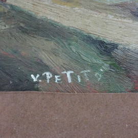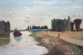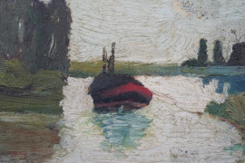 Paesaggio fluviale con imbarcazione, olio su tavoletta, cm 10,5x17 circa, firmato, entro cornice.