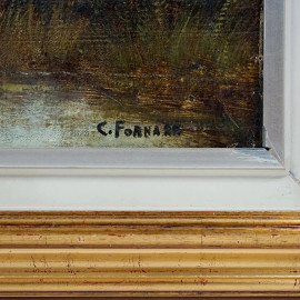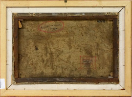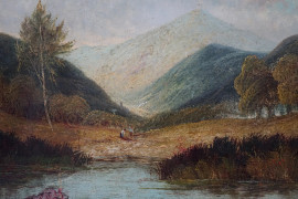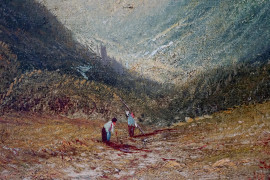 Paesaggio montano con figure, olio su tela, cm 40x62, firmato, entro cornice.