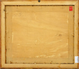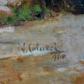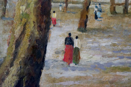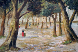 Parco con figure, olio su compensato, cm 50x60, firmato, entro cornice.